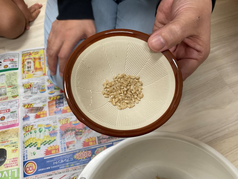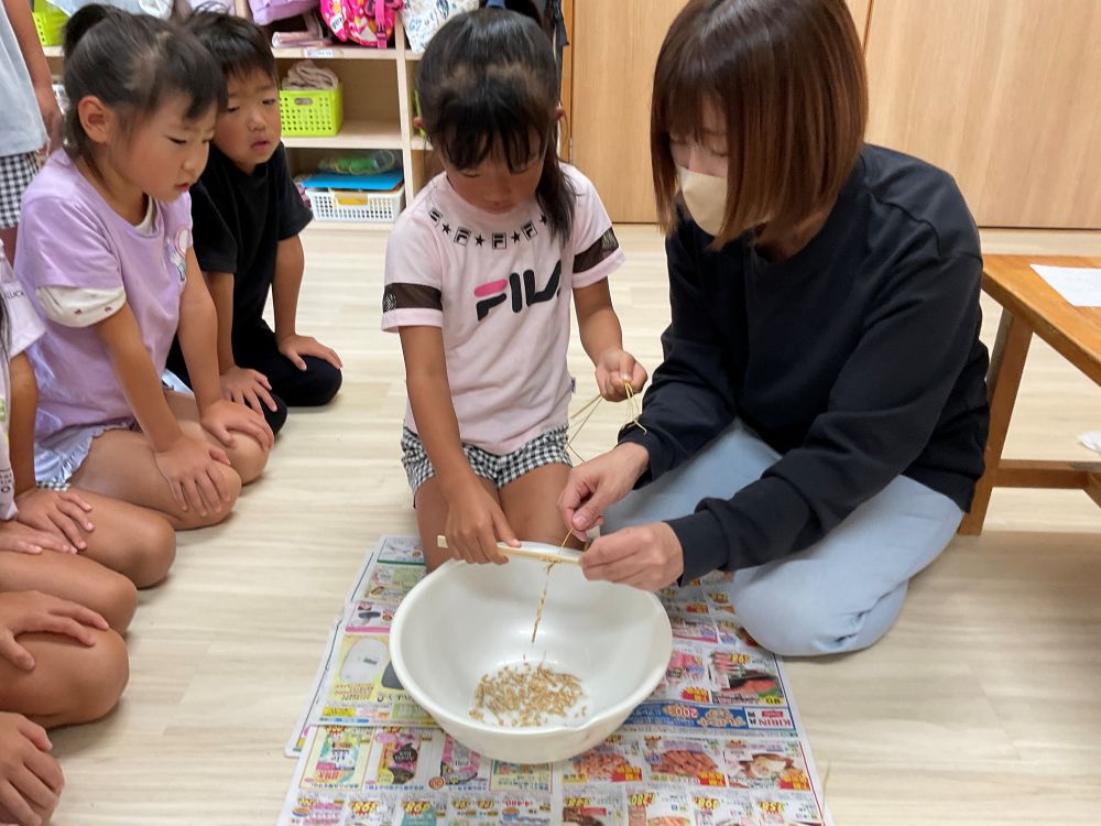 「お米がとれてよかったね」「茶色いね」とお話をしながら取り組んでいた子どもたち。