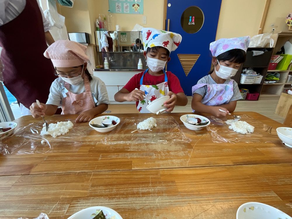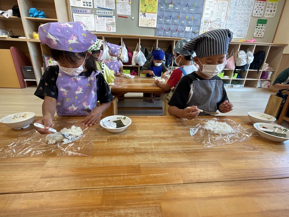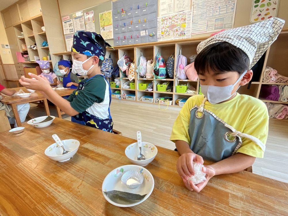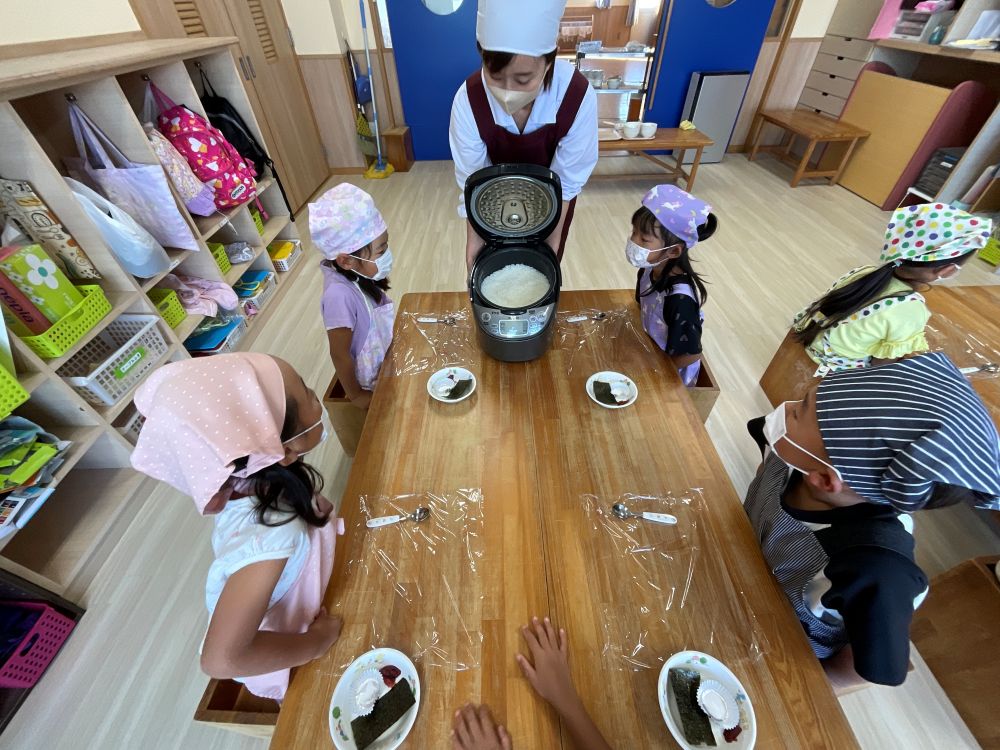 さくら組さんのクッキング!自分たちで栽培したお米と漬け込んでいた梅干しでおにぎり作りをしました。