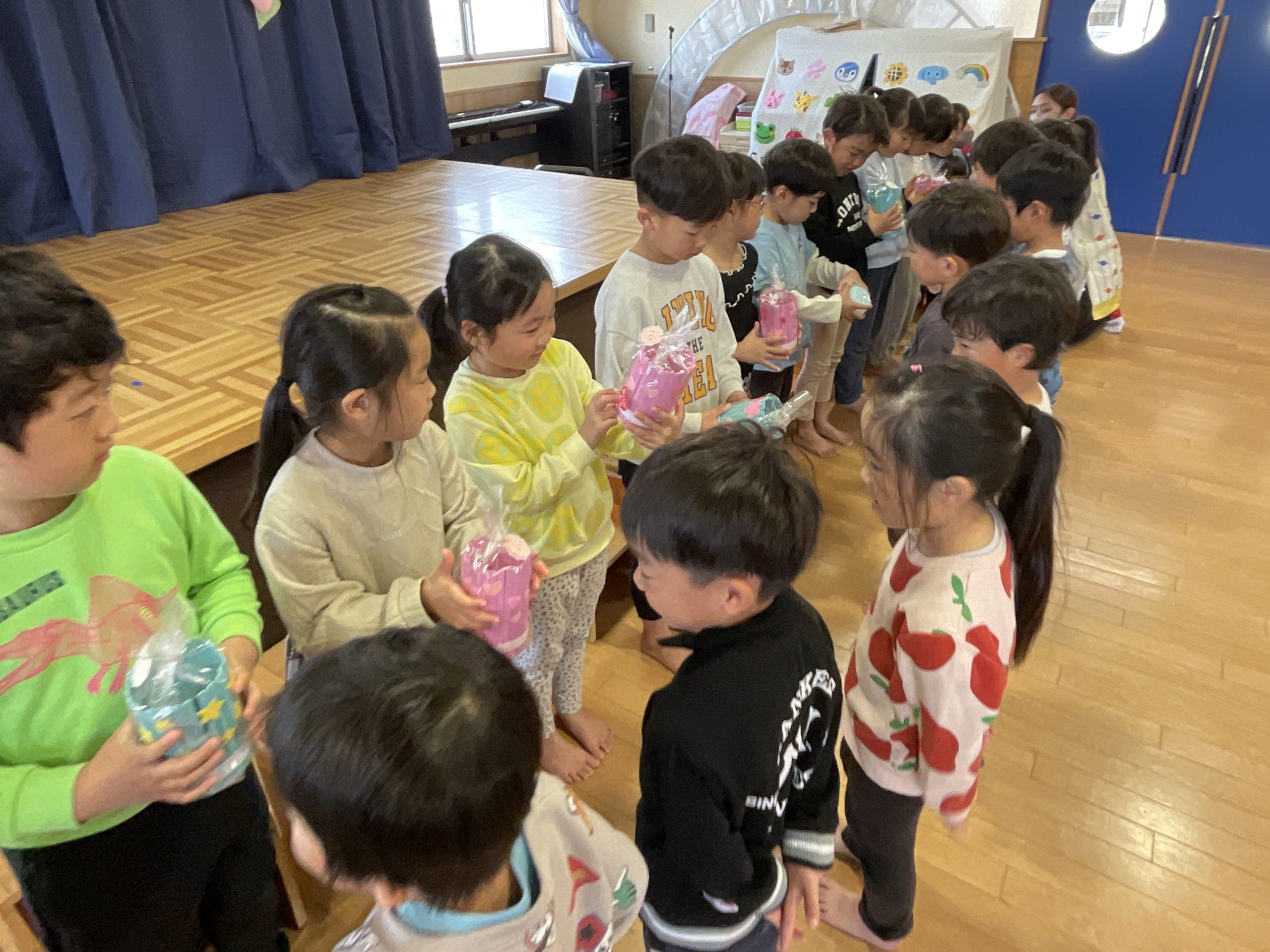 ゆりさんから手作りのペン立て、転園するお友だちには手作りのメダルをプレゼントしました
