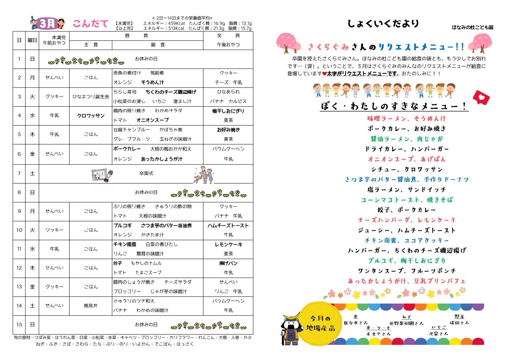 食育だより 3月号① 2026.02.25 3月は毎年恒例✨ 卒園を控えたさくら組さんの リクエストメニュー月間です🌸🌞 大好きな給食を大好きな友達と囲んで いい思い出を作ってほしいです💓 #大崎市 #古川 #ほなみの杜こども園 #こども園 #保育園 #保育教諭 #給食 #食育だより